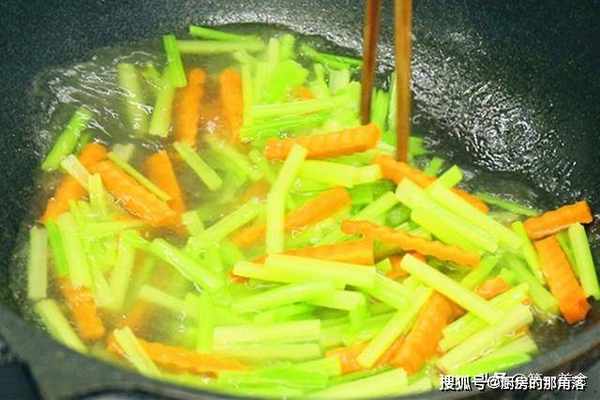 烧半锅开水,淋入少许植物油保持鲜亮的色泽,防止营养流失,把芹菜和胡萝卜放入锅中汆煮一下,这一步是为了方便后期快速炒熟、保持清脆的口感,煮至再次开锅即可倒出来,迅速用凉水冲洗过凉。