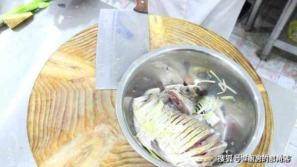 2.把鱼置于盆中,加入食盐,料酒,大葱白切成薄片,生姜切成细丝,和鱼放在一起翻匀了,腌制5分钟。