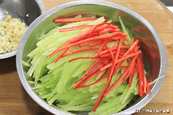 1.准备莴笋半根,削去外皮,切成均匀细丝,加入食盐2克,抓拌均匀,腌制5分钟给莴笋出水,腌好以后把水分倒出来,放入清水洗干净备用。