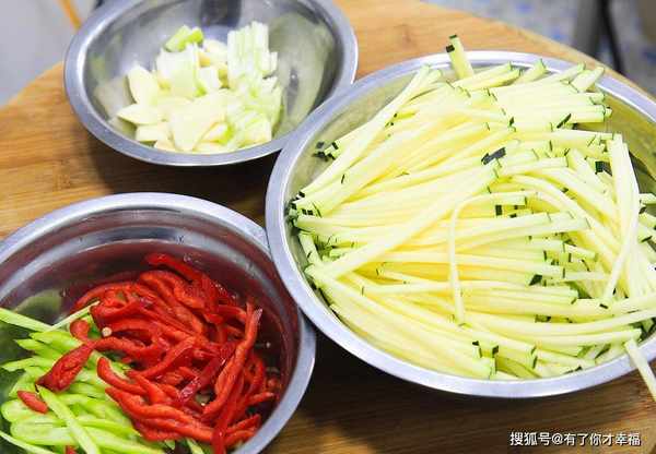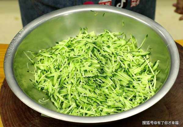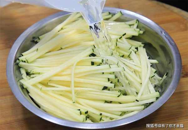 2.准备几根黄瓜,放入清水中洗干净,切成细丝放入盆中,撒入适量的食盐拌匀腌制一下,杀出里面的水分,等会包饺子不破皮还鲜脆。