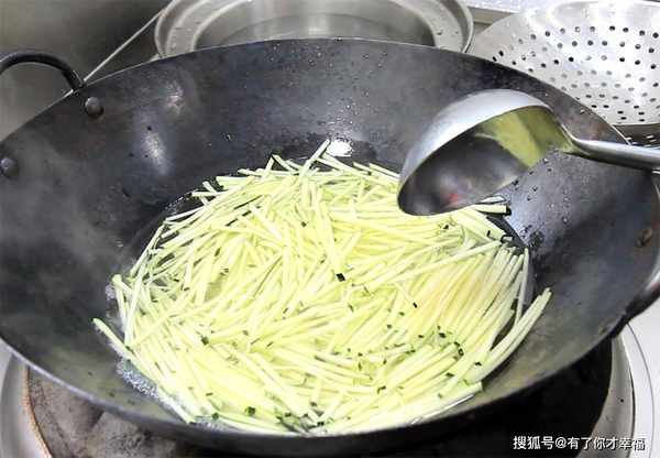 2.把锅烧热,多加一些植物油,油温五成热时,倒入葱丝开小火浸炸,经常搅动把里面的葱油炸出来,葱丝炸干、炸成金黄色时倒出来,用葱油炒出来的菜更香。