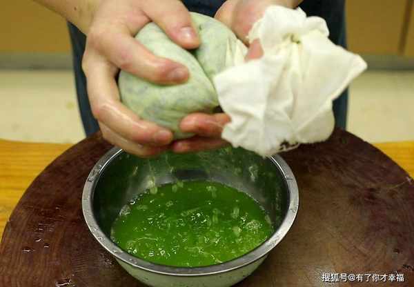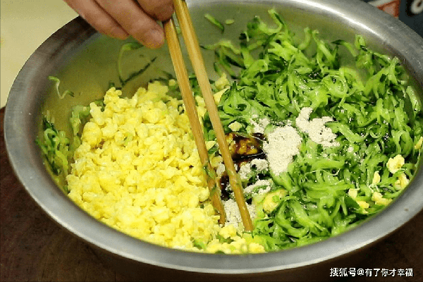 4.黄瓜腌好以后倒入漏勺中挤干水分,再用纱布包住挤一遍,充分去除里面多余的水分,淋入一些香油,让黄瓜裹上一层油膜,这样既能防止出水还能增加香味,倒入小葱花、鸡蛋,先不要调味,啥时候包饺子啥时候调味。