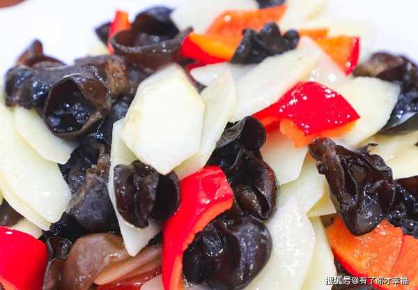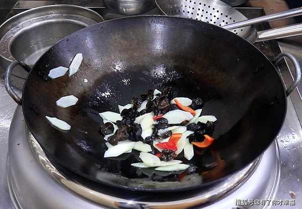 4.再次把锅烧热,加入刚刚炸好的葱油,把木耳、山药和红椒控干水分,油温五成热时,把配菜倒入锅中翻炒均匀,加入食盐2克,味精1克,转大火快速翻炒化开调料。