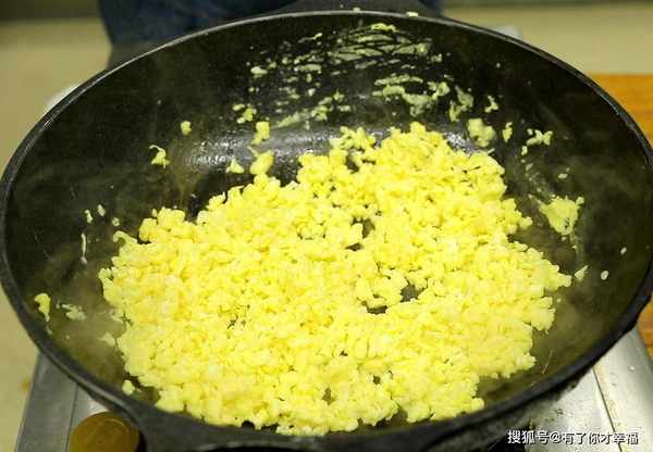 3.碗中打入几个鸡蛋,搅拌打散成蛋液,放入锅中用筷子搅散,全部定型以后倒出来,这样炒出来的鸡蛋又碎又嫩。
