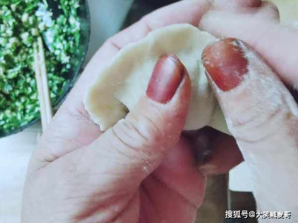 5、圆片中包入适量馅料,用手将边缘捏紧,防止煮的时候漏馅。