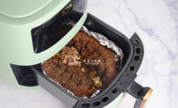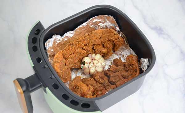 6.在空气炸锅里面垫上一张锡纸,将腌制好的五花肉放入炸蓝里,再放上一头大蒜;
