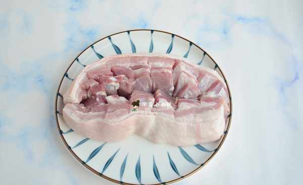 2.五花肉在水里浸泡出血水,改刀切成大块;