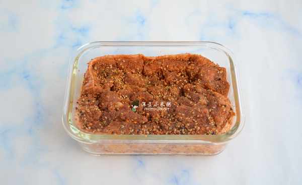 5.抓抹均匀的五花肉放入保鲜盒里面冷藏腌制4个小时或者冷藏过夜;