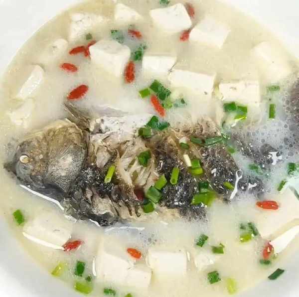 鲫鱼一条,嫩豆腐,葱花姜片,盐,白胡椒粉,油,白酒(料酒)。