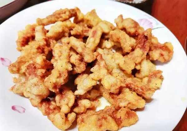 猪肉条逐一上好淀粉糊,热锅倒入适量花生油烧至七八成熟,将猪肉条下锅炸至表面金黄色后改小火慢炸。待肉炸透后再转大火炸至外干内熟即可。食用时蘸花椒盐调味即可。