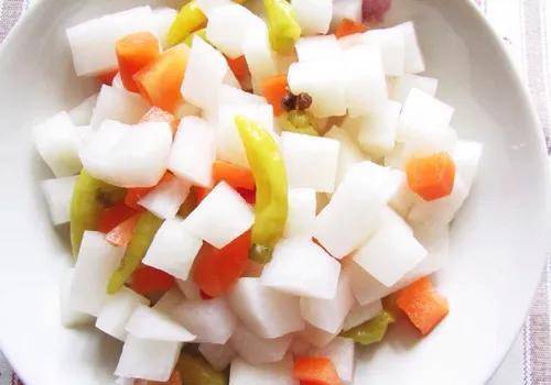 1.白萝卜、胡萝卜去皮切丁,樱桃小萝卜切成指头大小丁;
