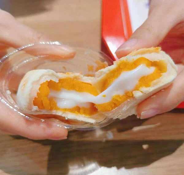 金黄色的外皮,上面点缀了白芝麻,从中间掰开,能看到一层洁白的雪媚娘,咸蛋黄包裹着乳酸菌留心,多层用料,层次分明,入口奶香浓郁,乳酸菌搭配蛋黄,咸甜中还带着一点点发酵的酸味,给你不一样的体验。