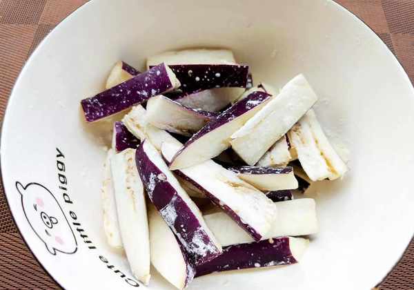②我们把茄子搓洗几次,挤干水分放入碗中。加入1勺淀粉进去,拌一拌,确保每根茄子上面都蘸上了淀粉。