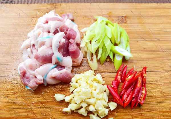 ⑥我们把五花肉的表皮刮一刮,搓洗干净后切成薄片。葱、小米椒、蒜子都清洗一下,切成碎末。