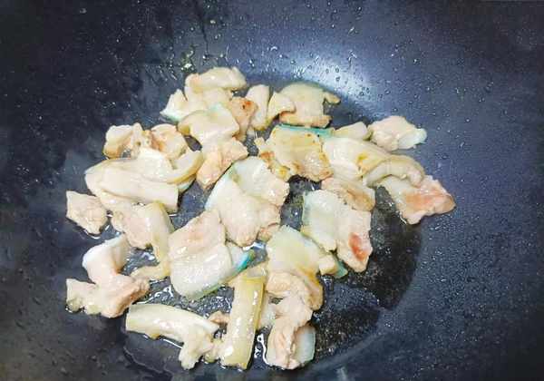 ⑦热锅冷油,倒入五花肉干煸。一直炒,直到五花肉的油脂煸炒出来,五花肉颜色发黄。