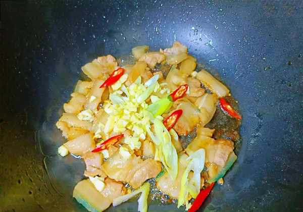 ⑧加入料酒去腥,翻炒均匀后再加入2勺生抽、1勺老抽增香上色。五花肉上色后倒入蒜末、葱末、小米椒去腥增香,爆炒几下。