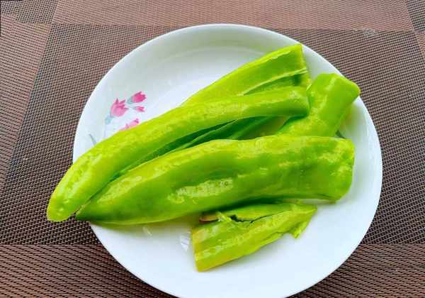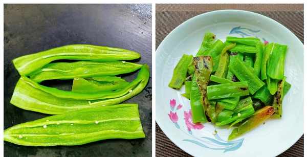 ⑤我们把辣椒放入锅中干煸,可以不加油。先把外皮煎到起虎皮,然后翻一面再把里面稍微煎一下,辣椒干煸软了就可以了。把辣椒切成长条,放入盘子中。