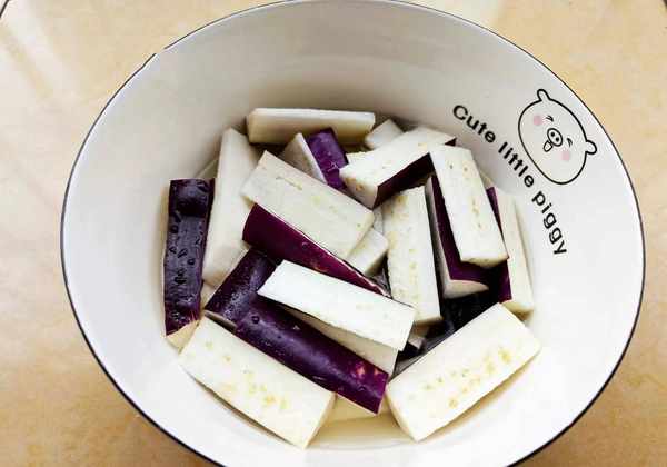 Tips:切开的茄子接触空气容易氧化发黑,加醋可以防止它发黑。泡在水中,再加一个盘子盖住,这样也断绝了空气,茄子就不易发黑了。