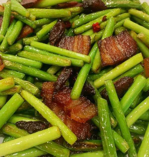 (2)另起锅倒油,加入生姜蒜末尖椒,倒入腊肉翻炒,再倒入香干蒜苔一起翻炒2分钟