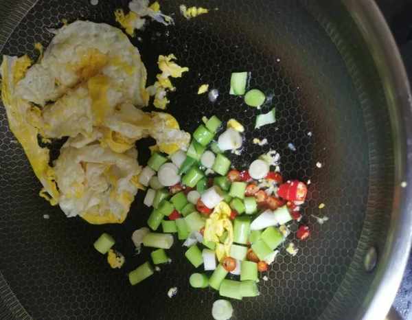4.将煎好的鸡蛋盛出或者用锅铲推到一边,下入小米辣和蒜苗根部爆香,至蒜香味四溢时加入1勺蒜蓉剁辣椒继续翻炒;