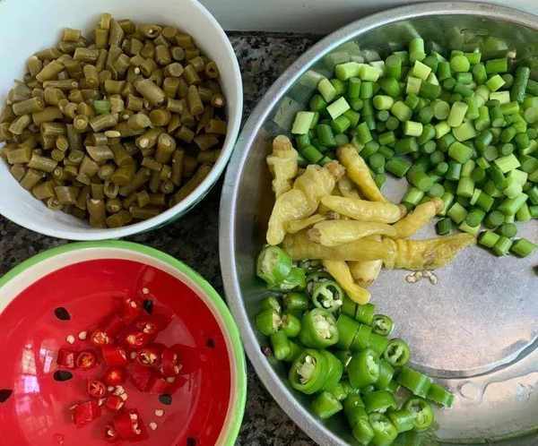2.准备配菜:酸豆角清洗干净切小粒;蒜苔清洗干净切小段;线椒、小米辣分别清洗干净切成小段;泡椒清洗根据备用;