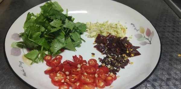 3.准备配料:小米椒清洗干净切成小段;干辣椒清洗干净切段;花椒清洗干净;大蒜用刀拍碎后剁成蒜末;香菜清洗干净切碎备用;