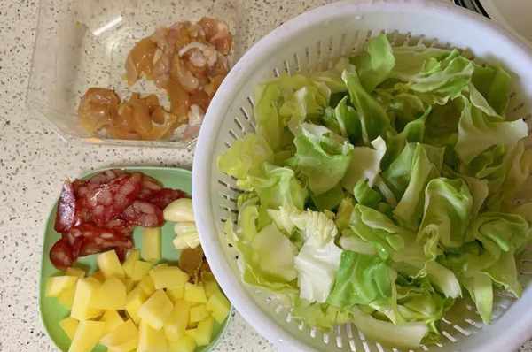 1.新鲜的包菜清洗干净,撕成小片;腊肠切成薄片;蒜用刀拍碎后剁成蒜末备用;