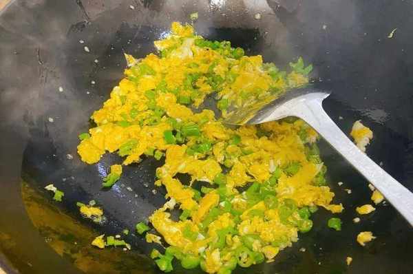 3.鸡蛋炒好后不要盛出来,加入切碎的青椒翻炒20秒左右;