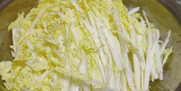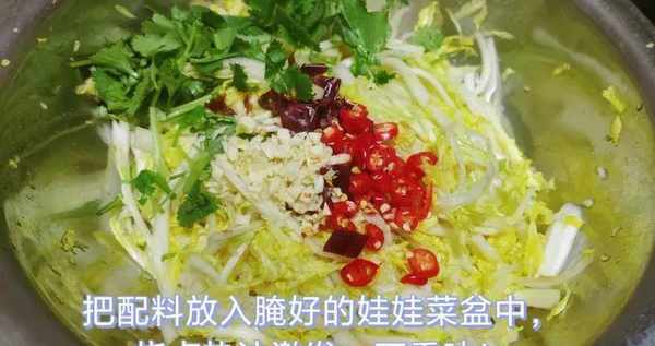 1.腌制娃娃菜:2颗娃娃菜,清洗干净切成细丝,放入大盆中,加入少许盐腌制10分钟左右;