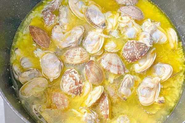 3.将焯水后的花甲倒入锅中,加入一碗清水,喜欢汤多的就加水与花甲齐平,喜欢汤少的就减半;