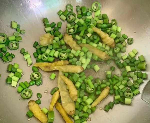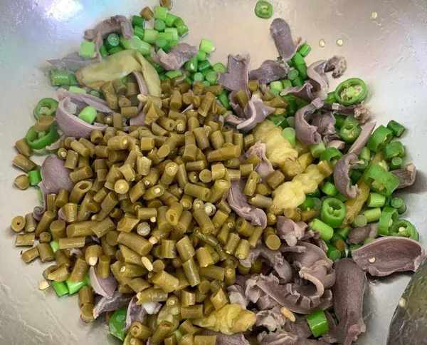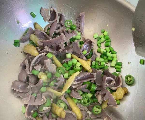 食材:鸭胗、酸豆角、蒜苔、泡椒、线椒、小米辣、姜