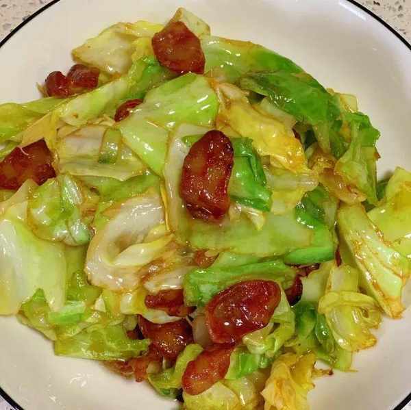 4.最后加入蚝油翻炒均匀,就可以装盘开吃,荤素搭配超级下饭的腊肠手撕包菜就做好啦。