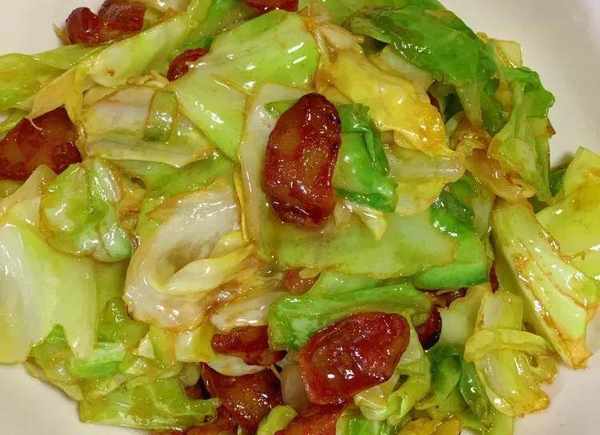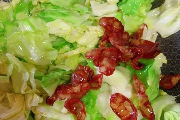 3.转大火放入包菜,翻炒2分钟至包菜断生,调入少许盐,加入蒜末、腊肠继续翻炒2分钟;