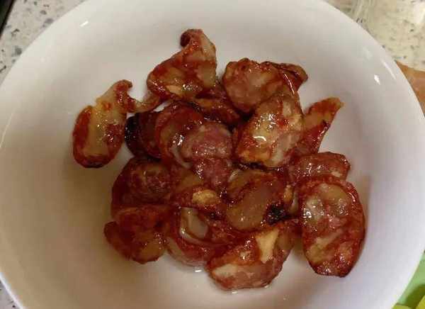 2.炒腊肠:起锅烧油,油温7成热时,油温升高后转小火,放入腊肠迅速翻炒5秒出锅,锅中留底油;