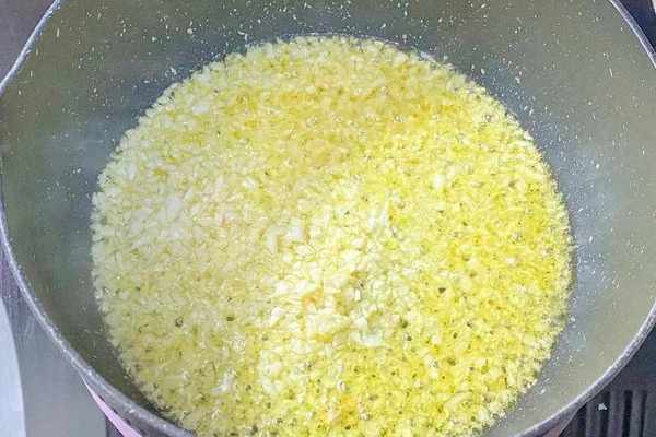 2.炒蒜蓉:锅烧热,加入菜籽油(菜籽油做出来比较香)烧至油温7成热时,下入蒜末小火慢炒出蒜香味,注意全程中小火,不要炒糊了,加1勺盐和白糖调味;