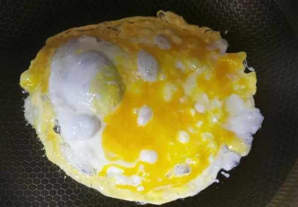 3.煎鸡蛋:锅烧热倒入少许油,倒入鸡蛋液中火煎至定型,翻面继续煎,蛋黄搓散;