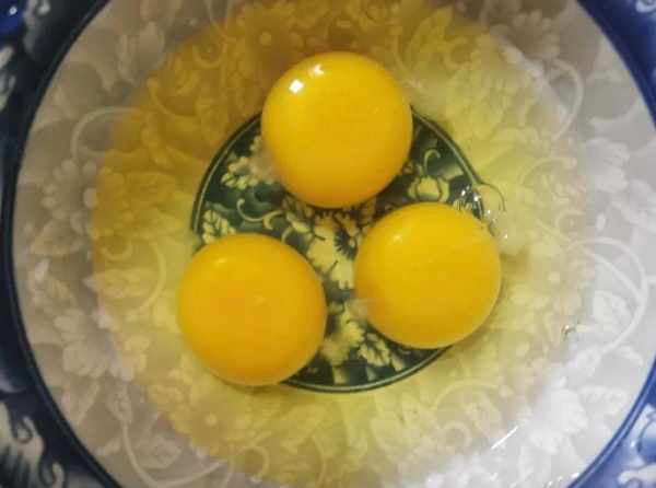 2.准备一个干净的大碗,打入3个鸡蛋,不用打散;