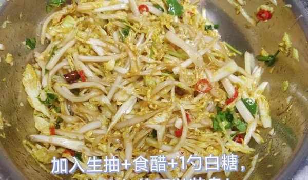 5.加入生抽、醋、白糖,搅拌均匀就可以装盘开吃了,放在冰箱中冷藏半小时口感更加脆爽,更加入味,爽口解油腻的凉拌娃娃菜就做好啦。