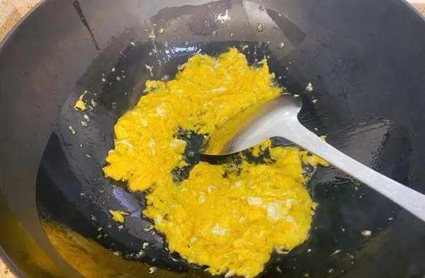 2.炒鸡蛋:碗里打入3个鸡蛋,加一勺盐后搅散。起锅热油,倒入蛋液后用筷子炒散,炒成鸡蛋碎;