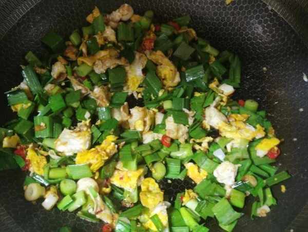 5.蒜苗根部炒快熟时,加入蒜苗叶子继续翻炒,鸡蛋用锅铲戳碎翻炒均匀;