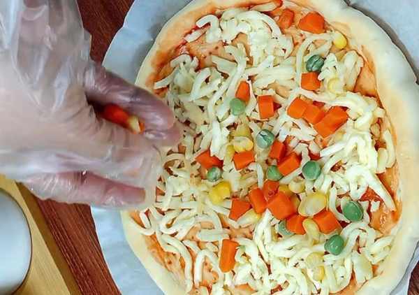再饼上先撒上一层薄薄的芝士碎,再放入焯过水的玉米粒、青豆、胡萝卜,满满的什锦蔬菜,营养价值绝对的均衡。