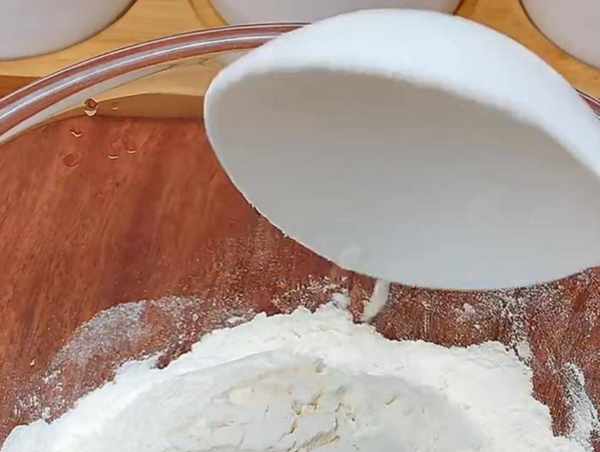我们买来适量的面粉加入适量的水和面,碗中放入一百克面粉,一克酵母粉,一克白糖,十克黄油,六十克的温水搅拌成面絮状。