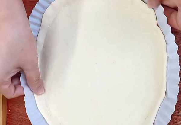 用擀面杖擀成一张大饼,放在提前准备好的模具里整理一下边缘,增加食欲。