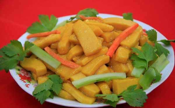 加上配菜炒熟后,外观看起来金灿灿的,入口滑而不腻,去弹口而不粘牙、柔韧而不失劲道。吃法也多种多样,令人回味无穷。这道菜也很受中老年人和小孩子的喜爱。