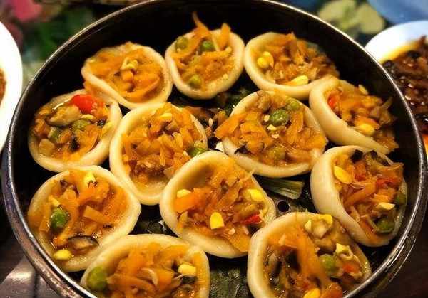 顾名思义,它的外形酷似灯盏状,蒸上一会儿,一笼香喷喷的“灯盏粿”就蒸熟了,一口咬下去满嘴都是里面的配菜,超级满足,好吃的粿胚咬一口滑嫩不粘牙,吃起来软软糯糯的,古时农家来客招待用,现发展为铅山名点。