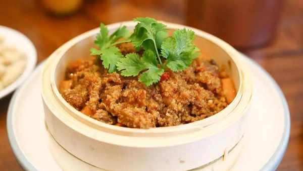 《随园食单》中曾写过这样一句话“用精肥参半之肉,炒米粉黄色”,此句所描写的正是发源于江西的粉蒸肉。粉蒸肉成菜后,肥嫩的五花肉被烤得焦黄脆嫩,浓稠的汤汁在盘子里,经灯光一照,映出来点点的油光,香味也是扑鼻而来的。