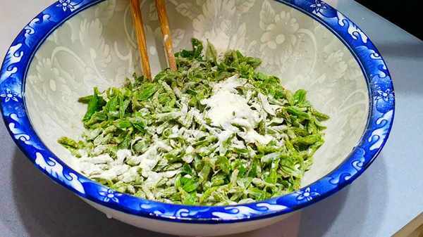 处理好的柳芽控干水分放到盆中,然后先加入适量的食盐和胡椒粉调味,搅拌均匀后再加入一勺食用油,目的是为了使柳芽不粘连,再次搅匀后加入一勺淀粉、两勺面粉,然后继续搅拌至柳芽裹满面粉即可。