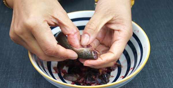 清洗好的泥鳅,我们接下来就来处理泥鳅。大家都知道,泥鳅的内部如果不清洗处理的话,那等会做出来的泥鳅,不是发苦就是口感差,所以我们还是要将泥鳅给进行处理。首先我们先拿出一只清洗好的泥鳅,在使用刀具,将泥鳅的头部和尾巴给剪掉,然后在把泥鳅的肚子部分,给对半剪开,将泥鳅肚子里的胆囊和有黑膜的地方给处理掉后,直接装入一个干净的碗中就可以了。