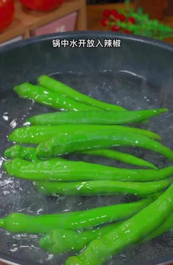 放到一个大碗中给它加点小苏打粉和水泡5分钟,这样洗出来的辣椒很干净,起锅烧水,水开放入洗好的辣椒,烫个30秒捞出沥干水分备用(切记不要烫的时间太长)