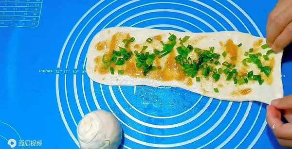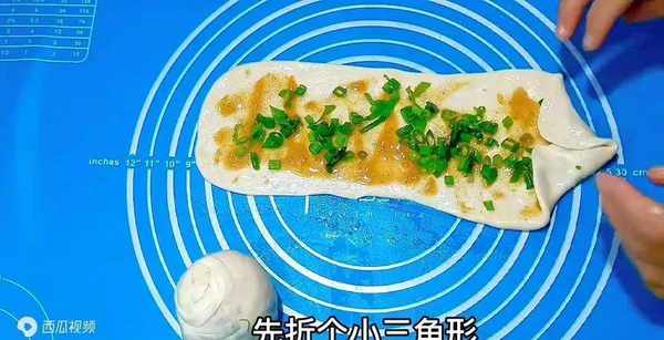 先折个小三角,再慢慢卷起,一边卷,一边轻轻拉下,这样可以多卷几层,层次更多。卷成一个个小圆面剂,把它们按扁,就是葱花饼的饼胚了。也可以在放锅里煎的时候,再按扁。